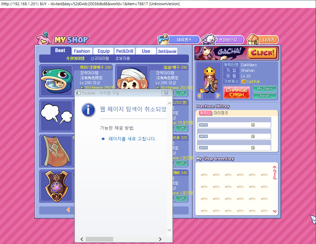 이건 하모니 버전인데 일단 구축할 당시 캐시샵을 누르면 튕기지는 않고 구매를 누르면 게임과 연결이 안되어서 웹페이에서 새로고침이 나오긴했는대