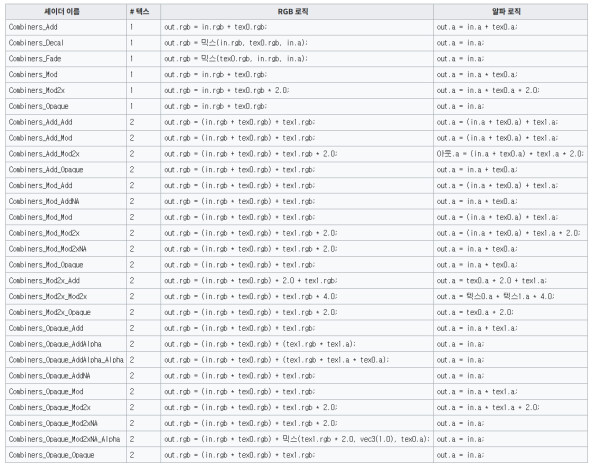 tex0.rgba, tex1.rgba 등은 샘플링된 텍스처를 포함하는 vec4입니다.