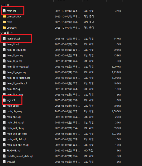 일단 main.sql , ragnarok.sql , logs.sql 만 배치 하고 문제없이 돌아갔습니다